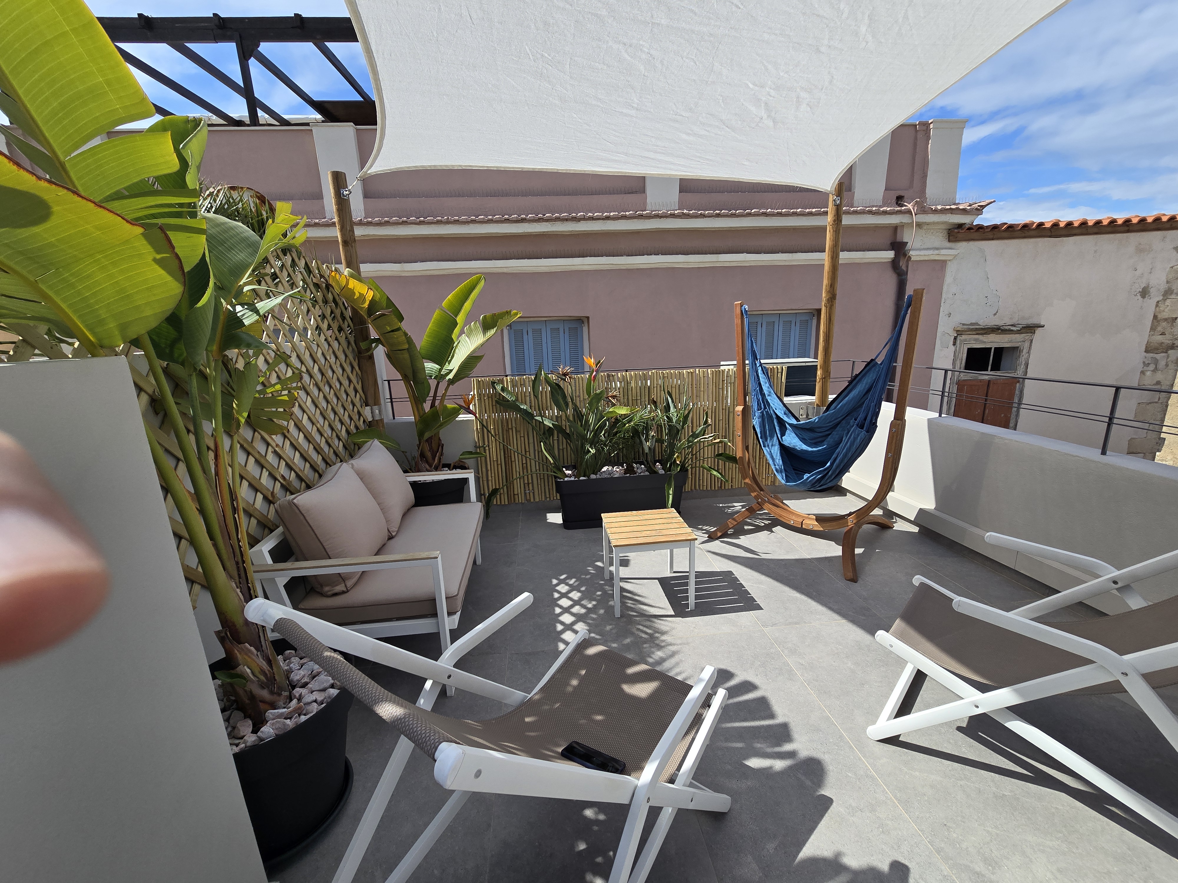 Two-storey apartment, consisting of two bedrooms, kitchen, living room, two main en suite bathrooms, secondary bathroom, and terrace. The kitchen is fully equipped with an electric cooker, refrigerator, microwave oven, dishwasher, washing machine, espresso coffee machine, electric kettle, and toaster. Free Wi-Fi Internet access, TV with satellite channels, 3 A/C units, iron, and ironing board, hairdryer, and safety box. The terrace is equipped with a dining table, chairs, and deck chairs. The apartment is within walking distance of supermarkets, bakeries, restaurants, cafes, pharmacies, and a parking lot (with a charge).